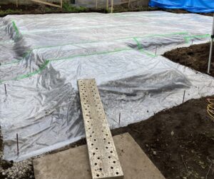 重機を使用して掘削作業、根切りとも呼びます。しっかり根切りを行い、砂利を敷き転圧し、防湿シートを敷きました。